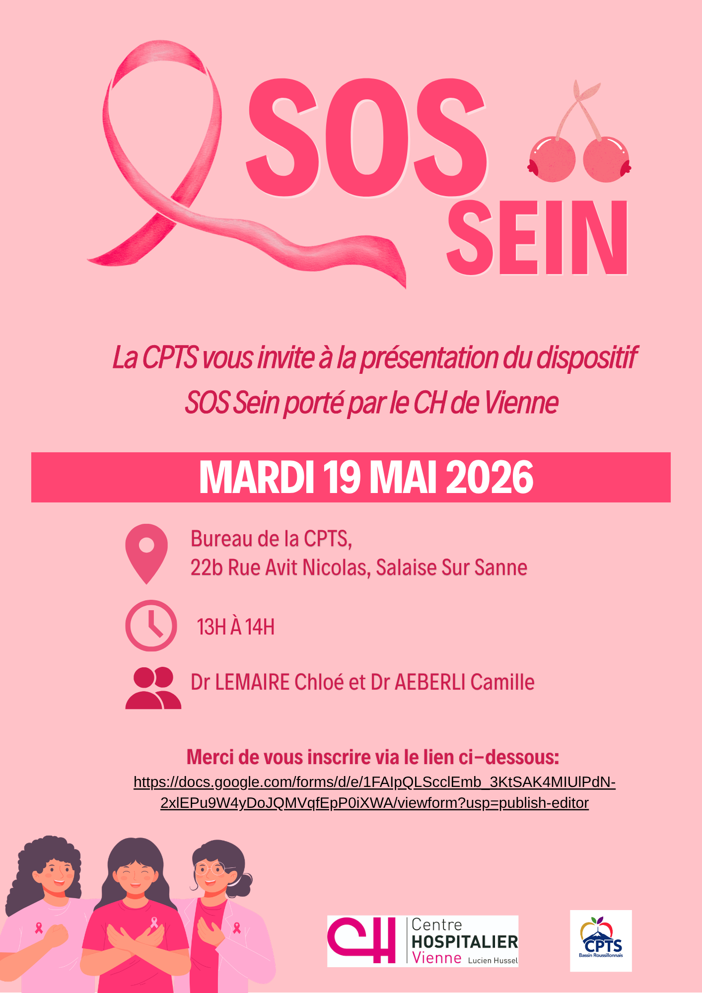 Présentation SOS Sein – CH Vienne Evènement réservé aux professionnels de santé et partenaires du territoire + Ajouter à mon Agenda Google + iCal / Outlook export 00 jours 00 heures 00 minutes 00 secondes Date Mai 19 2026 Heure 13h00 - 14h00 Partagez cet événement